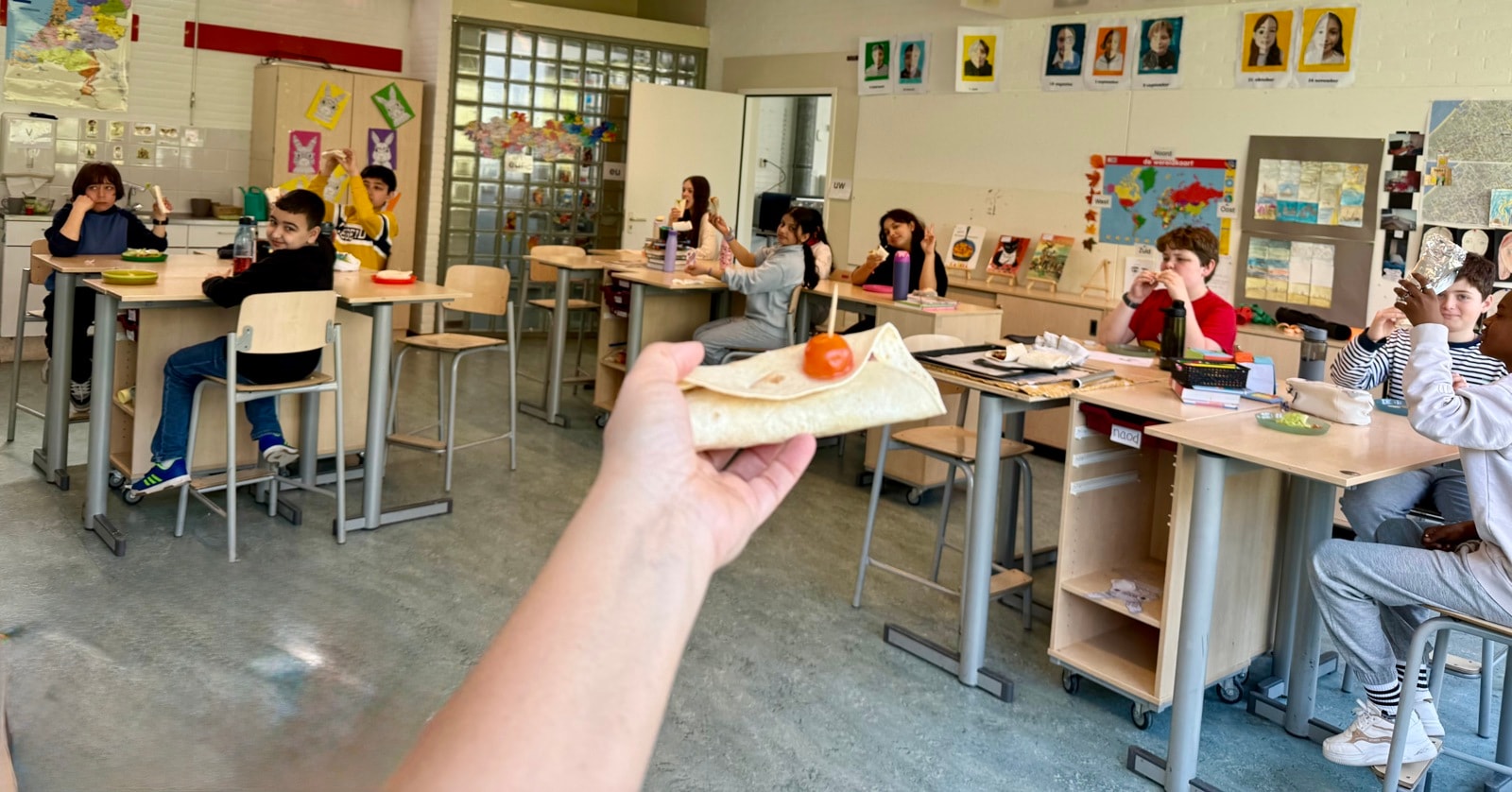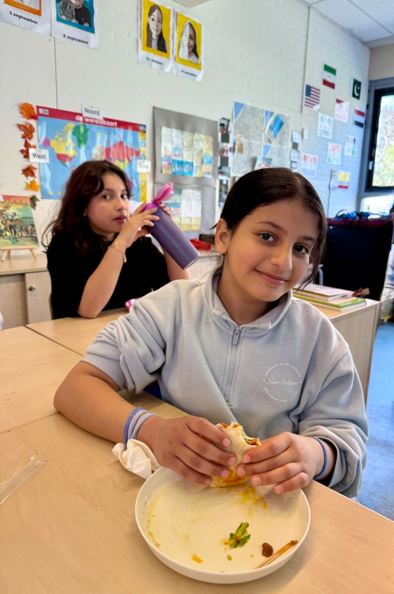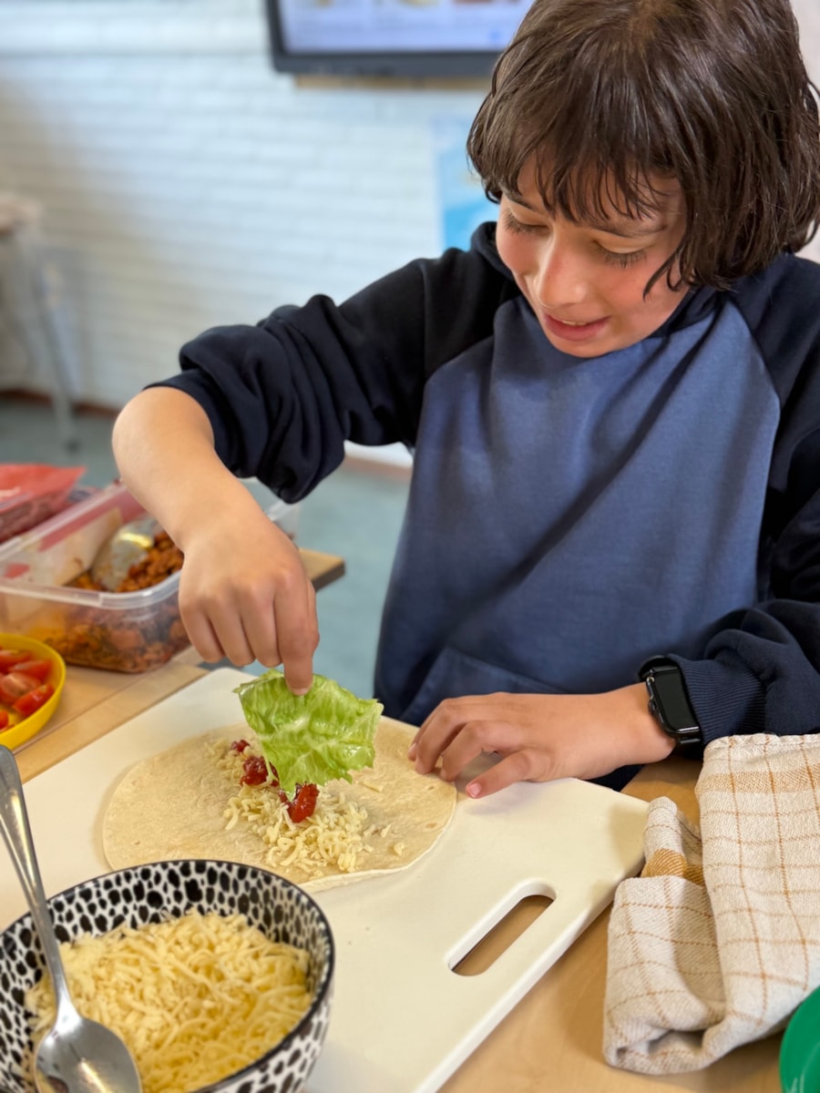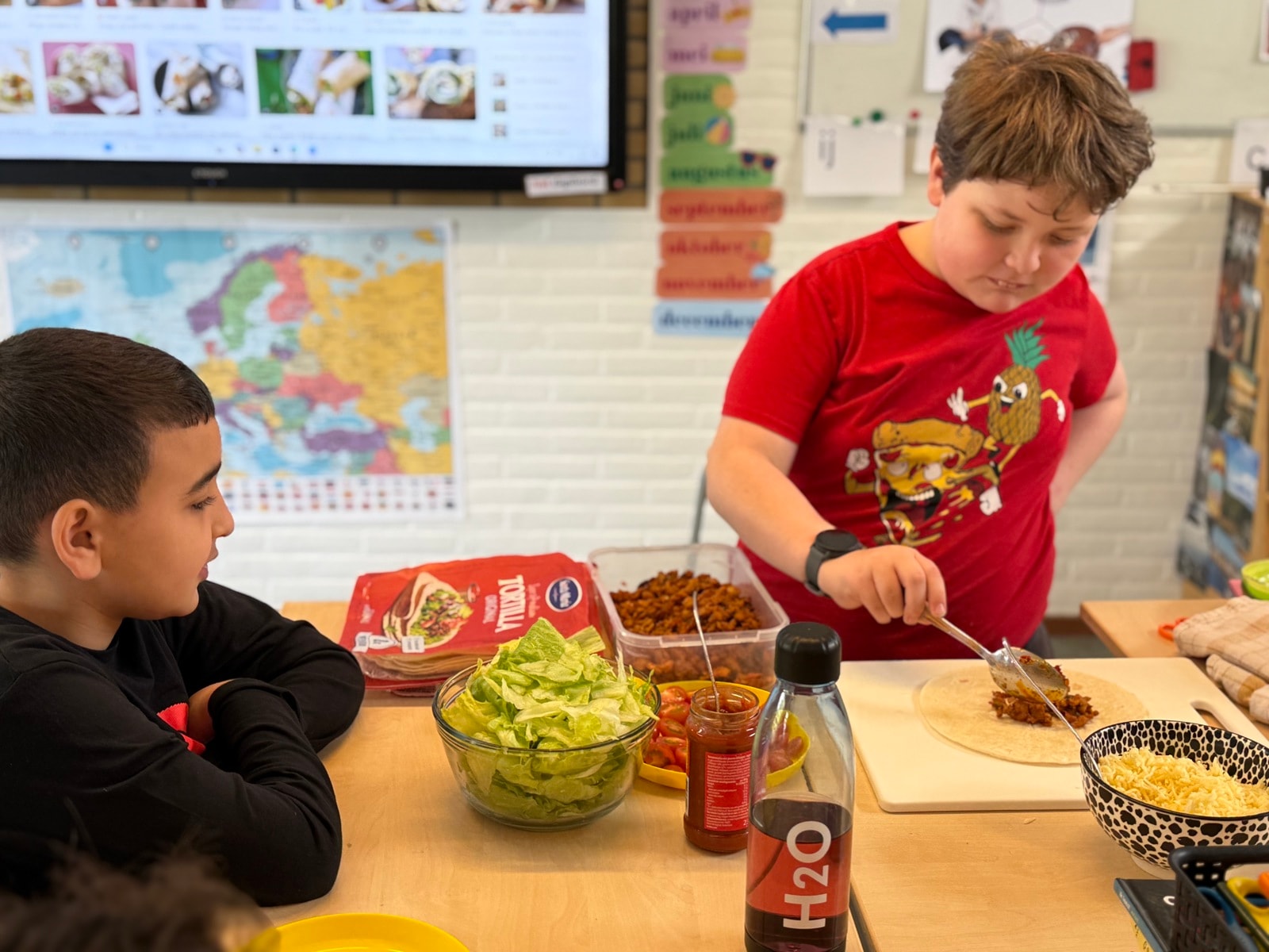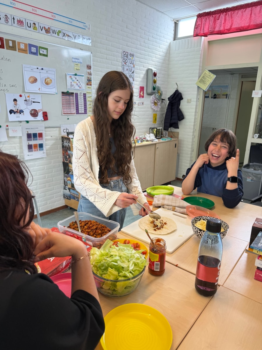 Afgelopen week hebben wij het thema In vogelvlucht afgerond en zijn we gestart met een nieuw thema: Eten. Dit nieuwe thema verdiende natuurlijk een smakelijke en pakkende opening. Daarom hebben we samen met de hele klas wraps gemaakt. Alle kinderen hebben enthousiast meegeholpen en het resultaat was verrukkelijk!